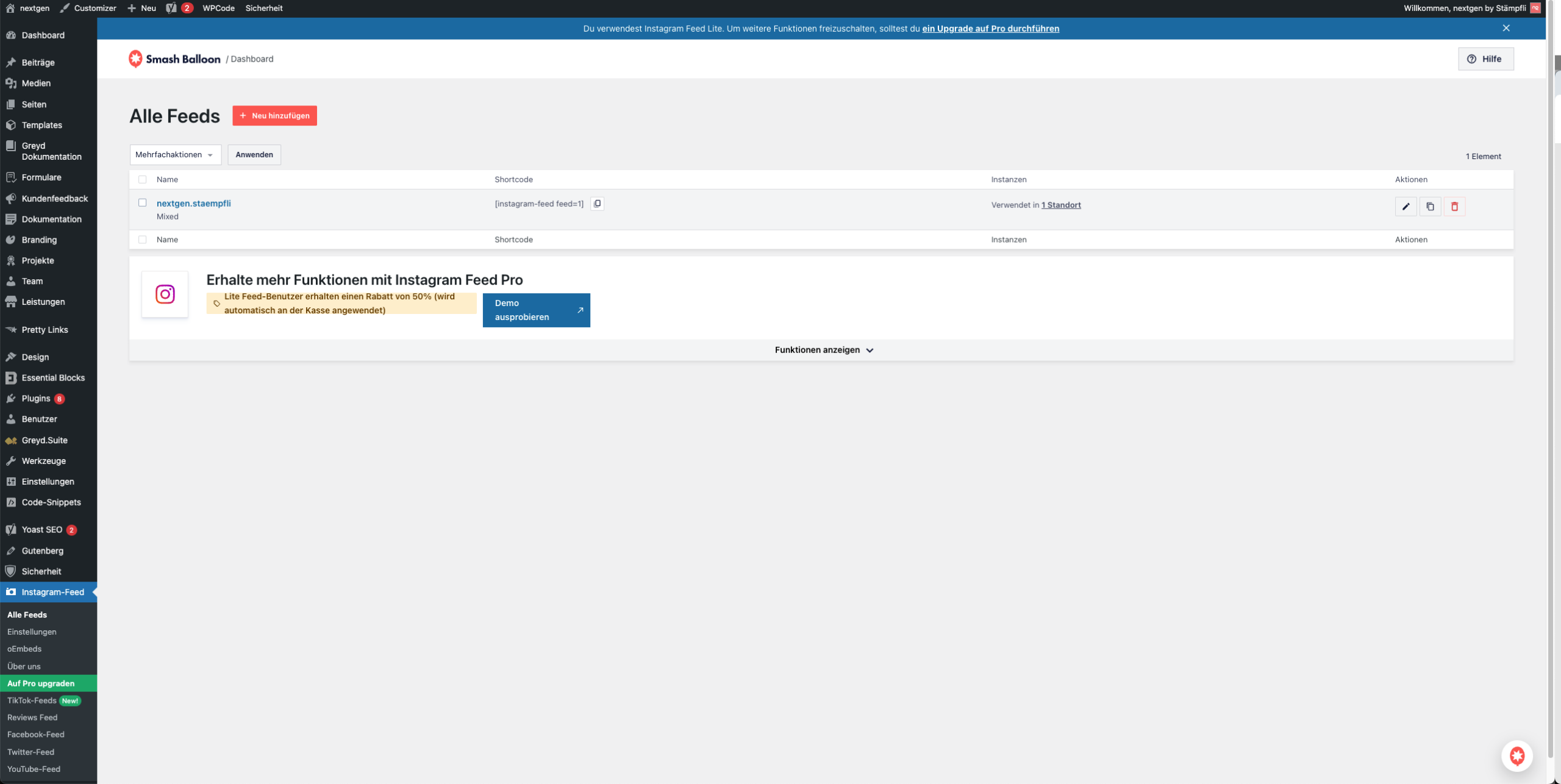 Die Funktion, von Instagram API’s erstellen zu lassen wurde Ende 2025 deaktiviert. Deshalb wurde das PlugIn “Smash Balloon” installiert.